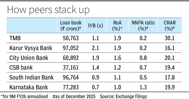 That said, at 1.1x book value and having delivered an RoA of 1.9 per cent (9M FY26 annualised), it still trades cheap relative to its regional private banking peers (see table). For instance, City Union Bank trades at 1.9x book value, but its RoA is a lower 1.6 per cent. Larger peer Karur Vysya trades at twice TMB’s multiple for an identical RoA and net NPA ratio. With growth back on track in the second half of FY26 and expected to continue into FY27, the risk-reward equation in our view, is favourable for an entry at current valuation. Hence long-term investors can accumulate the stock.