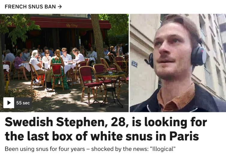 The ban got barely any media coverage in France, but was leading Swedish news sites as apparently Swedes living in, or simply visiting, France are panicking at the thought of having to be without their delicious addictive pouches.