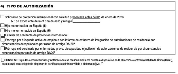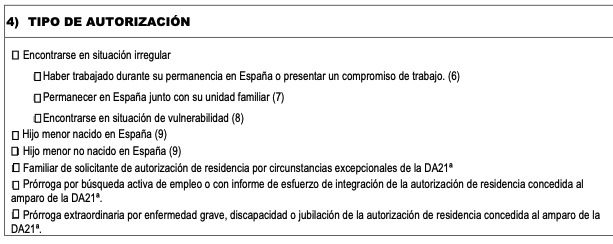 In section 4 applicants must specify their reason for regularising their legal status, including “have worked during their stay in Spain or provide proof of a job offer” alongside options for sickness, vulnerability and family ties.