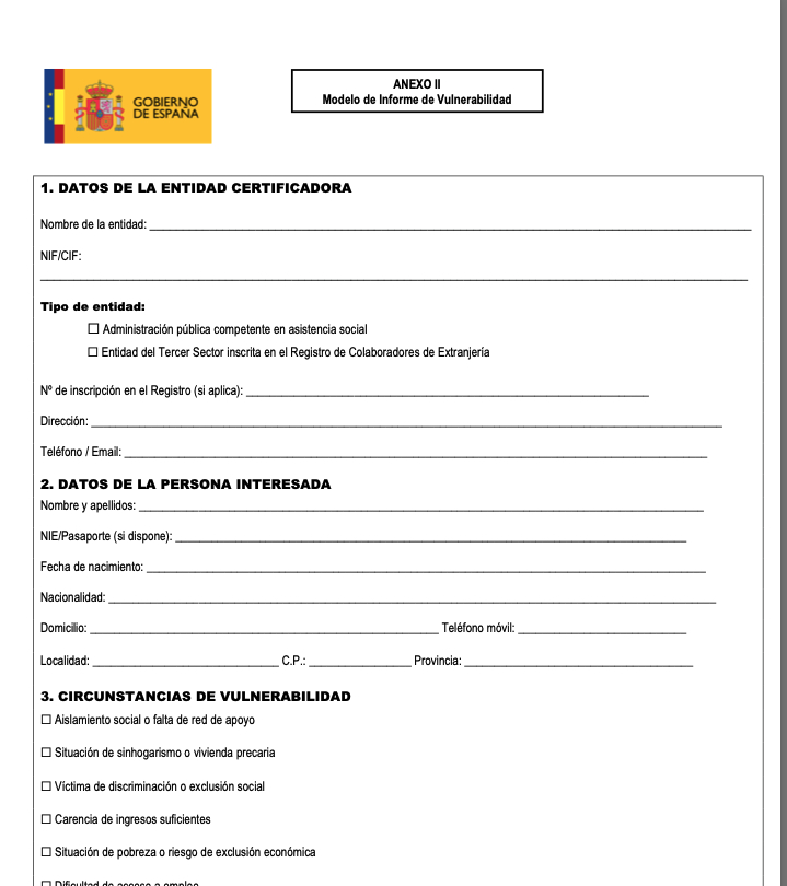 For those in a vulnerable situation you can also complete the informe de vulnerabilidad, but this is not necessary if you have already completed EX-31 for international protection. This is a document issued by social organisations or public authorities certifying social situations such as poverty, social exclusion, lack of income, homelessness or risk of abuse.